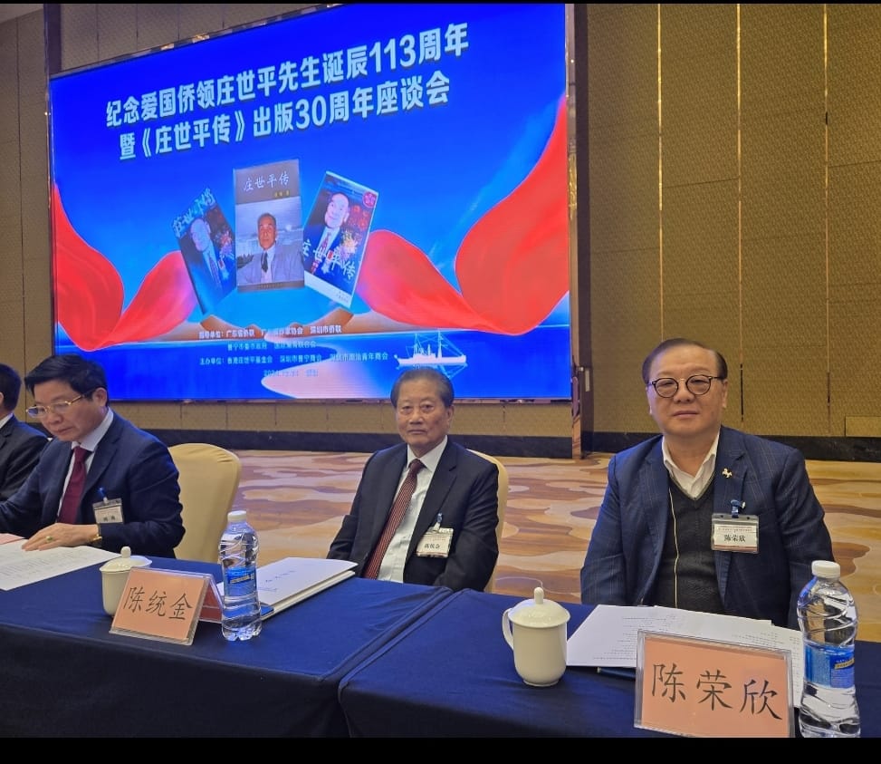 2024年12月24日上午,由廣東省僑聯、深圳市僑聯、普寧市委市政府、國際潮青聯合會等單位指導,香港莊世平基金會、深圳市普寧商會和深圳市潮汕青年商會聯合主辦的紀念愛國僑領莊世平先生誕辰113周年暨《莊世平傳》出版30周年座談會在深圳登喜路國際大酒店舉行。本會出席活動的有陳統金榮譽會長,陳榮欣副會長兼秘書長,蘇瑞通副會長及江培炎副會長。會上大家分享莊老生平以及有關《莊世平傳》一書的精神。莊老一生愛國,愛港,愛鄉,無私奉獻,深得大家敬重。是次活動共150多人參加。