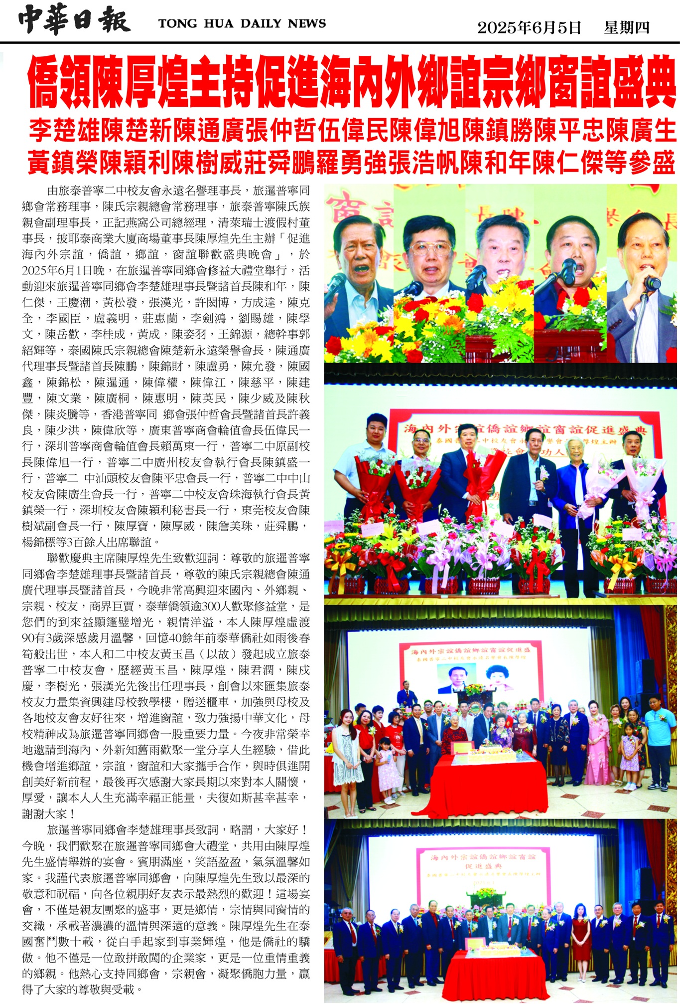 聯歡會慶典主席陳厚煌先生致歡迎詞:「今晚非常高興迎來國內外鄉親、宗親、校友、商界巨賈、泰華僑領逾 300 人歡聚修益堂,是您們的到來益顯篷璧增光,親情洋溢。感謝大家長期以來對本人關懷、厚愛,謝謝大家!」